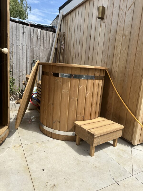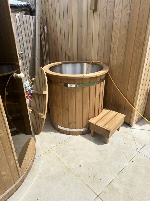 Built for recovery and resilience, this handcrafted cold plunge combines a stainless steel inner tub with a durable Thermowood exterior. The natural wood finish, secured with polished stainless steel bands, blends beautifully into any garden or wellness space.